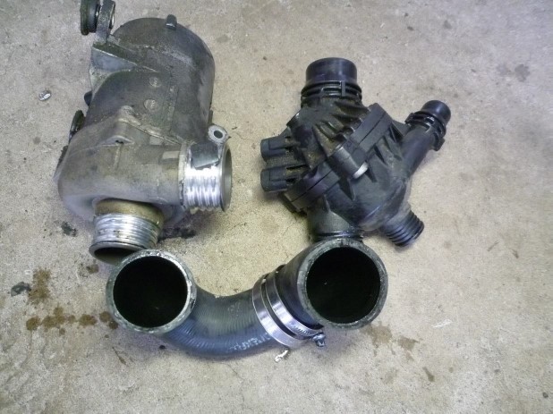 点検及び確認のために 電動ウォーターポンプとマップ式サーモスタットを別々に外したところです。
